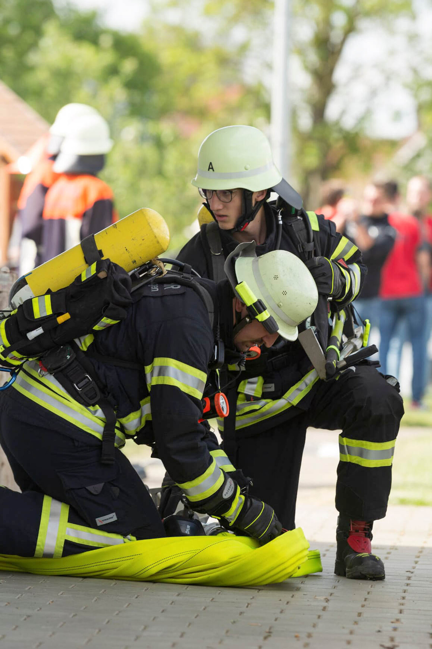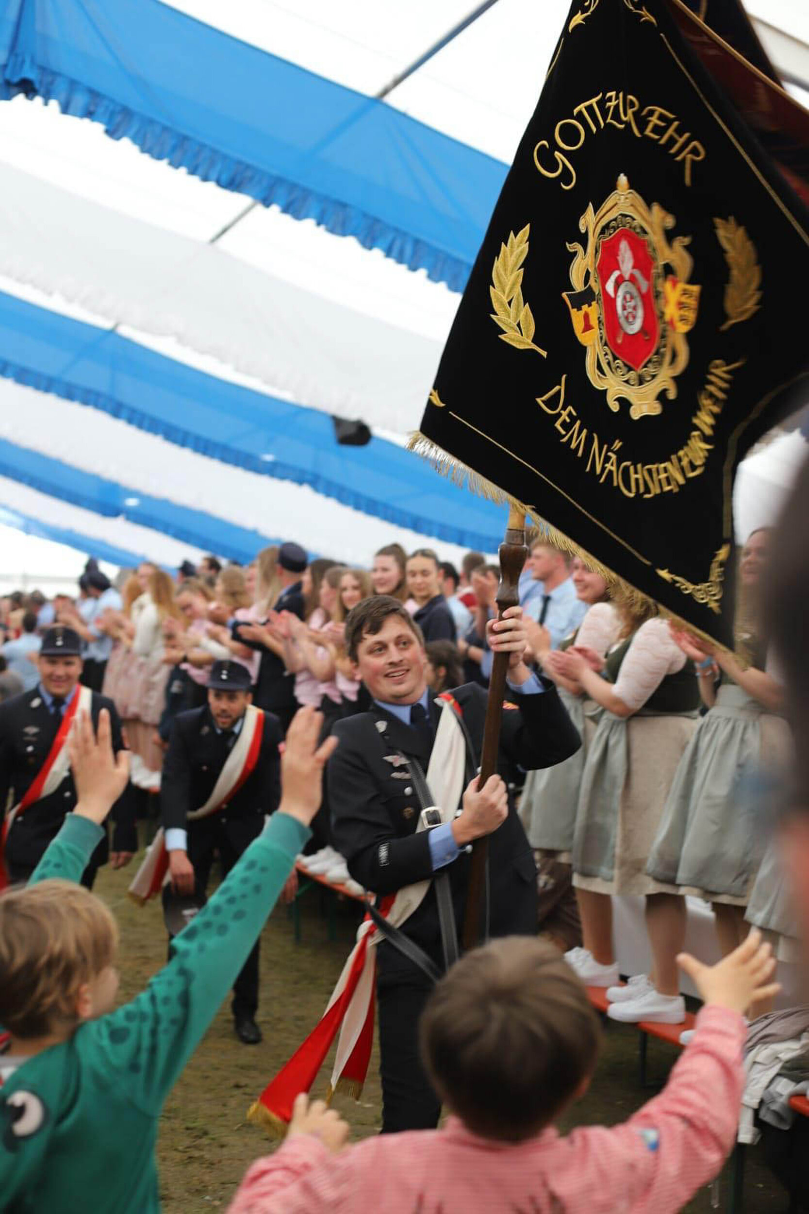 Über fünf Monate später war es dann endlich soweit. Am Samstag, den 04. Mai 2024 ging es pünktlich um 14:00 Uhr mit einem vielseitigen Kinderprogramm los. An diesem Nachmittag kamen auch wir das erste Mal zum „Einsatz“: Eine große Schauübung mit den Feuerwehren Nähermemmingen, Baldingen und Nördlingen stand auf dem Programm. Die angenommene Übungslage wurde uns bereits auf der Anfahrt mitgeteilt: „Brand 3 – Gebäudebrand, Personen in Gefahr“ heißt konkret, dass im Sportheim direkt neben dem Festplatz ein Feuer ausgebrochen ist und sich anscheinend auch noch Personen im Gebäude befinden. Die zahlreichen Zuschauer, darunter natürlich viele Kinder, verfolgten jedes Detail der Übung ganz genau. Wie erst das Tragkraftspritzenfahrzeug (TSF) aus Nähermemmingen ankam, die Lage erkundete und wie schon kurze Zeit später unser Löschgruppenfahrzeug 10 (LF 10) an der Einsatzstelle eintraf und dessen Besatzung unter Atemschutz den Innenangriff und die Menschenrettung übernahm. Auch die Nördlinger Kameraden hatten mit ihrer Drehleiter und einem speziellen Fahrzeug für lange Schlauchstrecken (Gerätewagen Logistik 2) alle Hände voll zu tun. Nach einigen arbeitsintensiven Minuten konnte schließlich Entwarnung gegeben werden: Alle Personen konnten aus dem Gebäude gerettet werden und waren wohlauf. Hier gilt noch einmal ein ganz besonderer Dank an die beiden Festdamen der Jubiläumswehr, die ganz hervorragend die zu rettenden Personen gespielt haben.