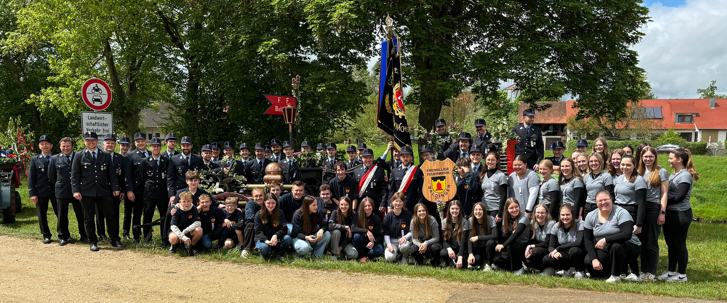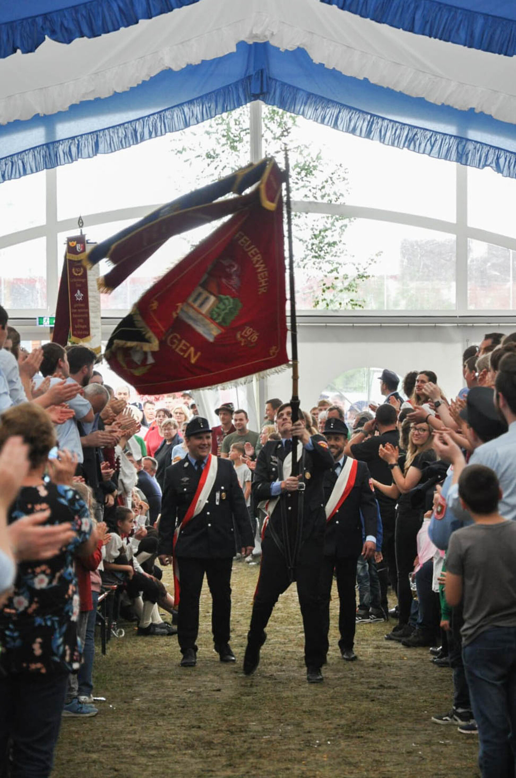 Direkt im Anschluss ging es für uns und alle anderen eingeladenen Feuerwehren zur Aufstellung des großen Festumzugs. Nach ein paar einzelnen Regentropfen verzogen sich zum Glück die Wolken und der Umzug konnte bei nahezu perfektem Wetter stattfinden. Ohne Frage war es für uns eine besondere Ehre, als Patenverein direkt hinter der Jubelwehr laufen zu dürfen.